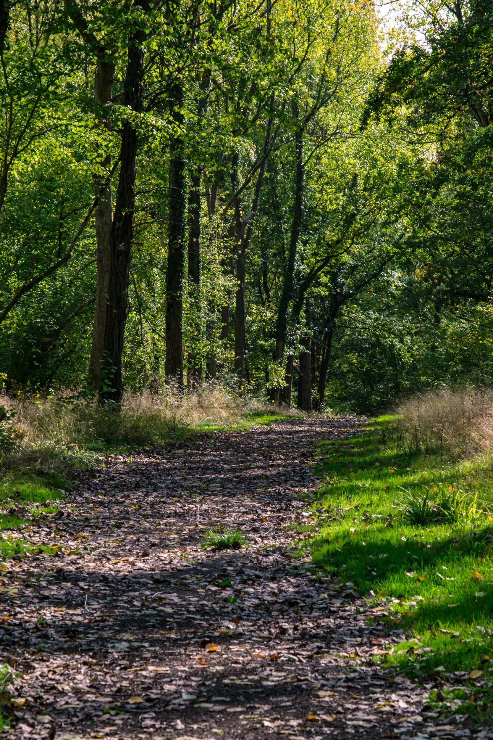 A dirt walking trail through a lush green forest with tall trees and sunlight filtering through the leaves.