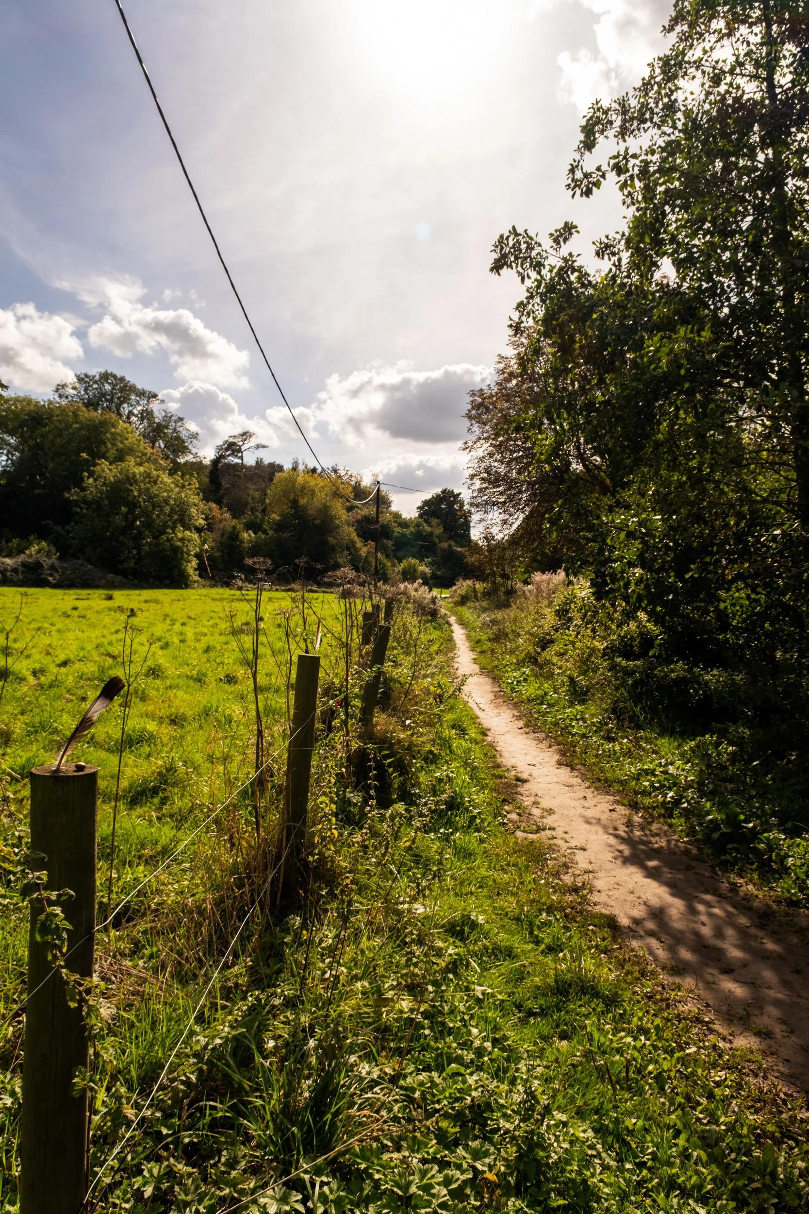A dirt walking trail runs alongside a green grassy field on the left and dense trees on the right, with a wire fence separating the trail from the field. The sky is partly cloudy with sunlight shining through.