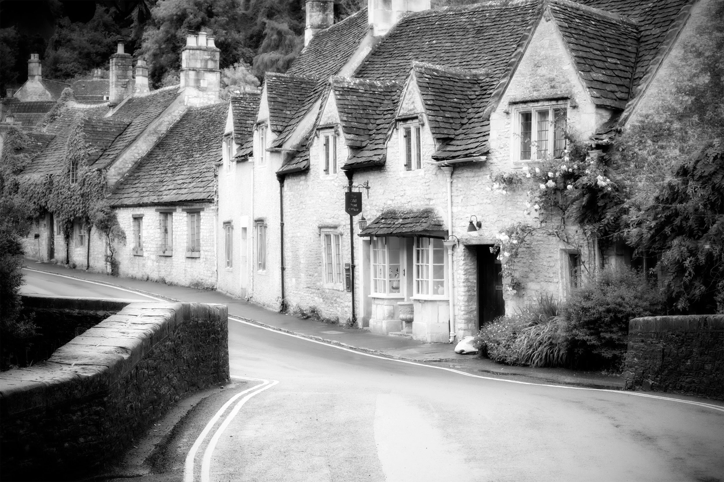A black and white photo of a row of old stone cottages with steeply pitched roofs, small front windows, and a curved road in front. There are trees and shrubs around the houses.