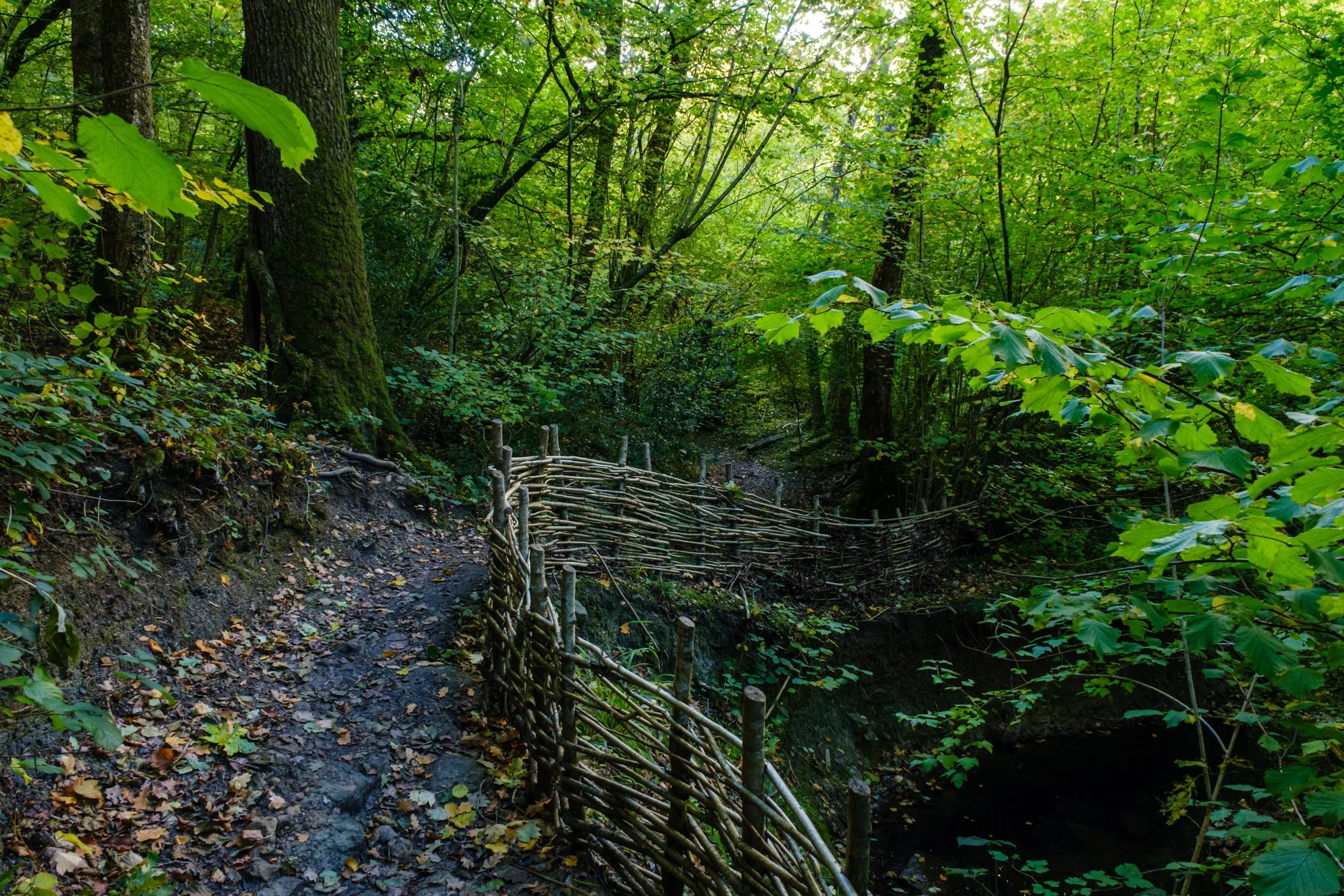 A wooded forest trail with a woven wooden fence on the right side, lush green foliage, tall trees, and a dirt path covered with fallen leaves.